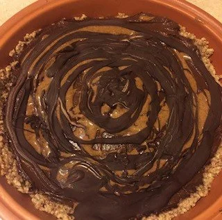 Add the chocolate mousse filling to the cooled pie crust. Microwave chocolate chips and drizzle chocolate and almond butter over the pie.