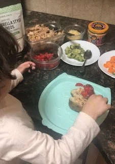 When the potatoes are almost done (or reheating), have your kids assemble the topping bar. Let them be creative with adding the toppings of their choosing to different small bowls and setting up their topping bar.