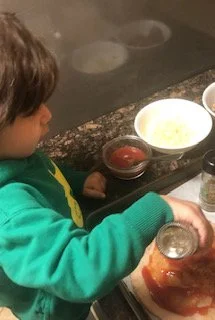 Let kids spread tomato sauce, sprinkle cheese, and add their favorite toppings to their pita pizza.