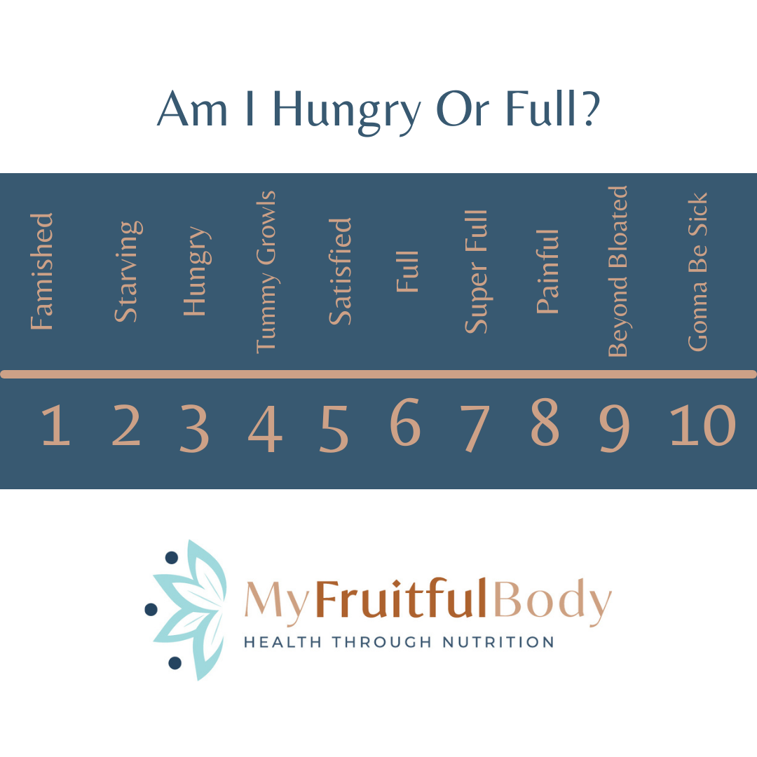 In practice, I use something called the hunger and fullness scale with patients to help them gauge their bodies natural hunger and fullness cues.